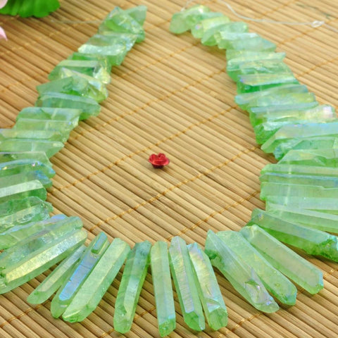 15.6 inches matte titanium coated mystic drilled crystal,quartz points,rough dagger gemstone ,spike tower beads, green color
