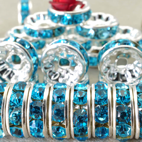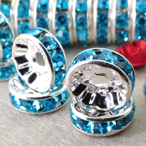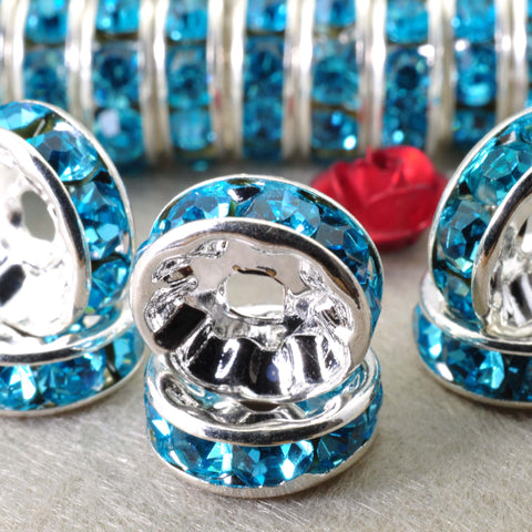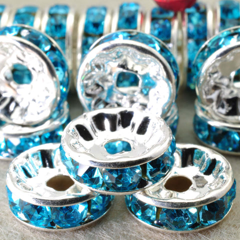 100pcs silver plated aqua blue crystal rhinestone rondelle spacer beads wholesale findings jewelry-straight edge