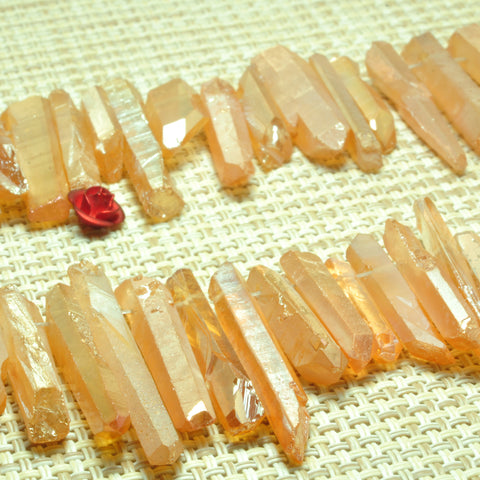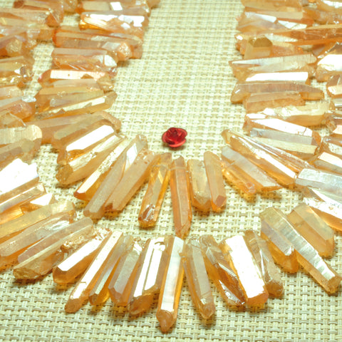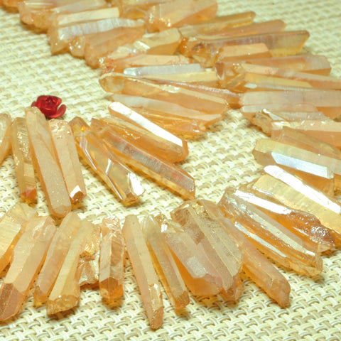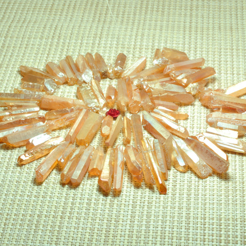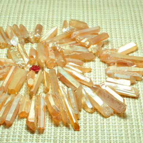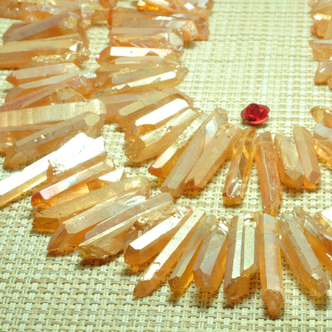 Quartz crystal points titanium coated orange mystic rough matte spike stick beads 15"